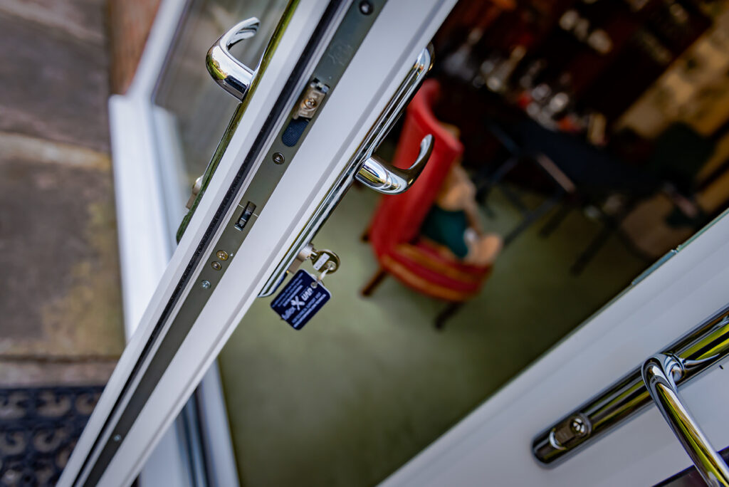 PVC vrata karakteriše: višaekomorni PVC profili sa čeličnim ojačanjem, višestruko dihtovanje za bolju izolaciju, kvalitetan okov (šarke, brave, ručke) za pouzdano zatvaranje i mogućnost različitih ispuna – puni panel ili staklo.